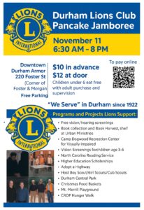 The Durham Lions Club is continuing a long-time Durham tradition. Come get your pancake breakfast, lunch or dinner or all 3 on Tuesday November 11th (Veterans Day) from 7am to 8pm. Tickets are $10 in advance and $12 at the door. Kids 6 and under eat free with adult purchase and supervision.